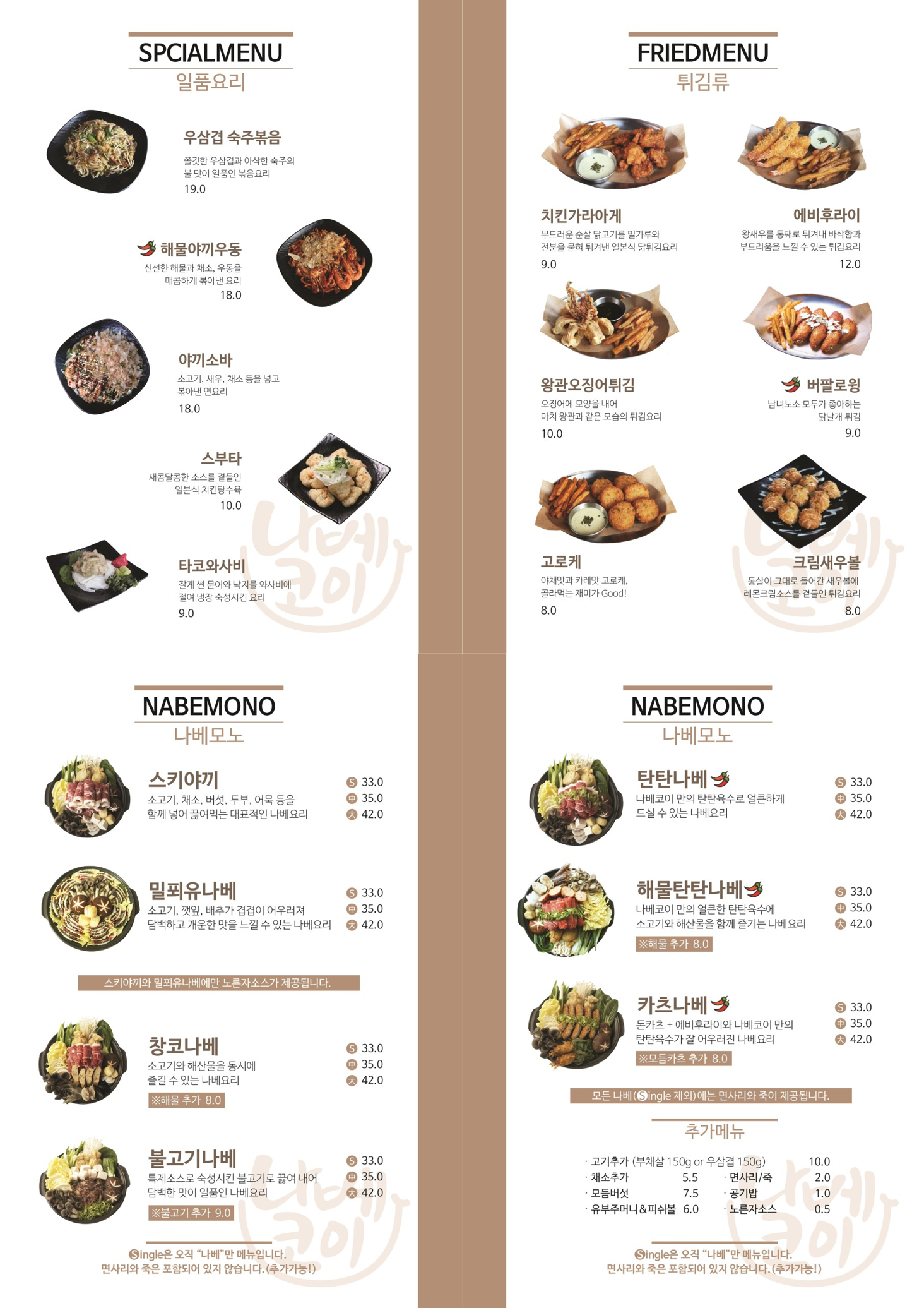 메뉴판은 이렇게 요리, 튀김, 나베 종류로 나눠져있어요